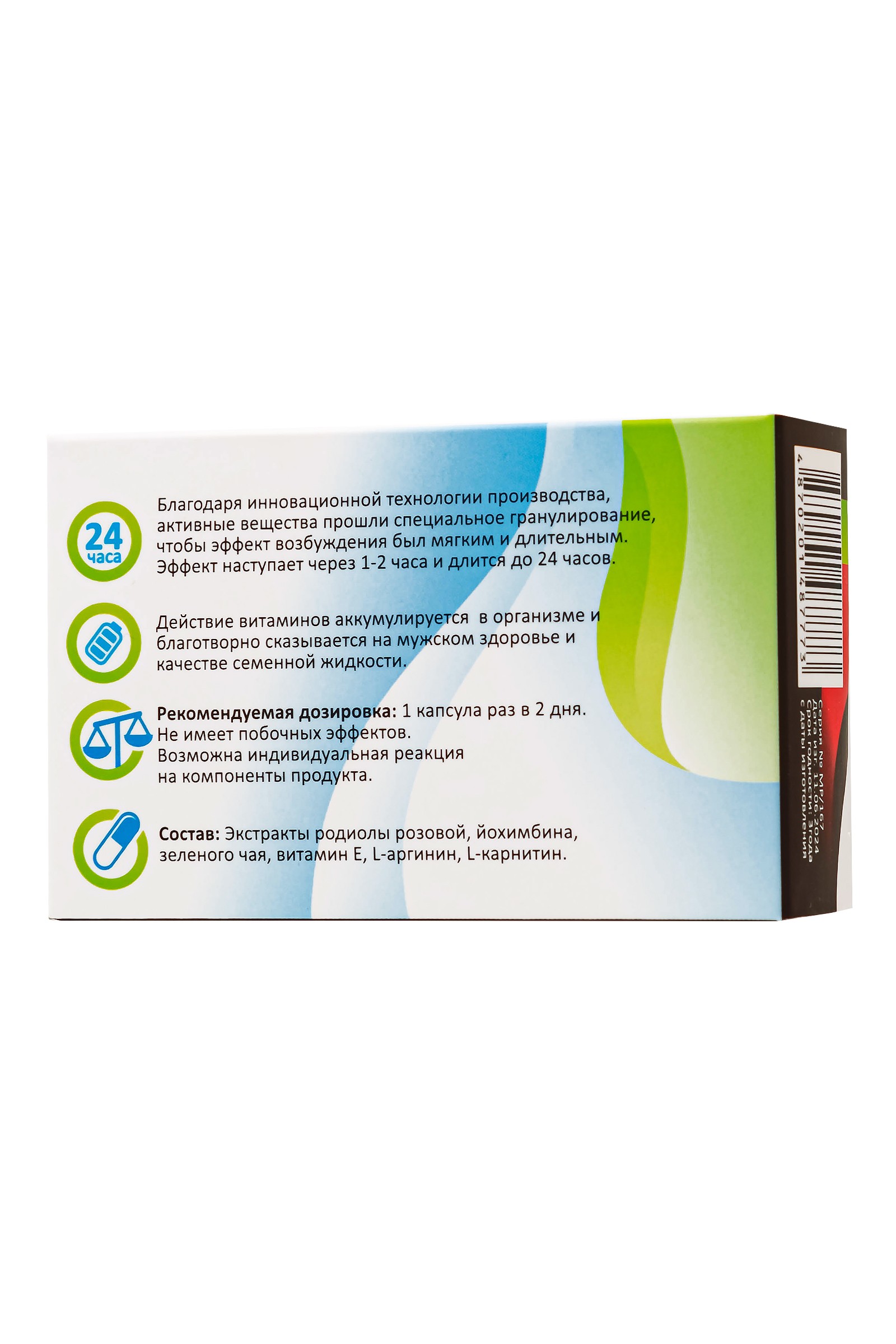 Представьте себе естественное решение для поддержания и восстановления мужской силы! Менс Пауэр - это уникальный натуральный препарат в форме капсул, созданный специально для мужчин, желающих улучшить свою потенцию и качество интимной жизни. Менс Пауэр - один из самых мощных и безопасных мужских БАДов, повышающих интимную выносливость и поднимающих ваш секс на новый уровень. Экстракт сине-зеленых водорослей (спирулина) и другие компоненты обогащают мужской организм необходимыми витаминами и аминокислотами. Благодаря особой оболочке гранул действие препарата длится дольше. Аминокислоты (L-аргинин, L-карнитин) являются активными имуномодуляторами, L-карнитин улучшает качество и количество семенной жидкости, подвижность сперматозоидов и их концентрацию. Это настоящая природная сексуальная сила, которая помогает преодолеть хроническую усталость и вернуть молодость вашим ощущениям. Способ применения: эффект наступает через 1-1,5 часа и действует до 24 часов. Курсовой прием аккумулирует эффективность и длительность действия препарата.