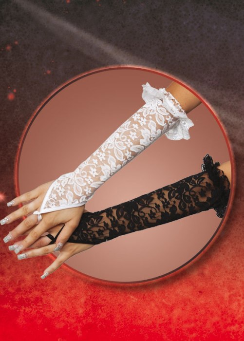 Перчатки кружевные до локтя,открытые пальчики,крепление на среднем пальце.В районе локтя украшены оборкой
