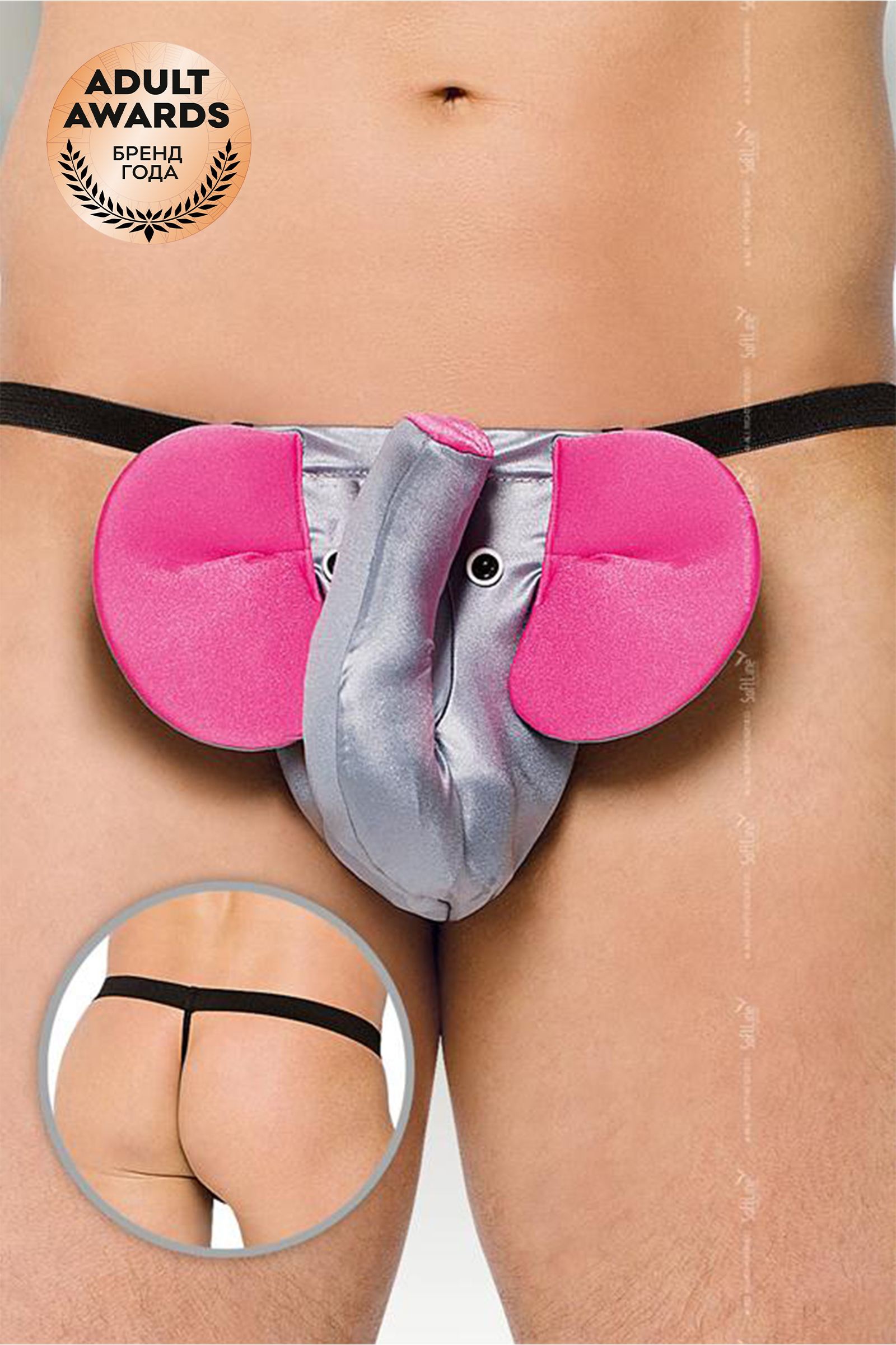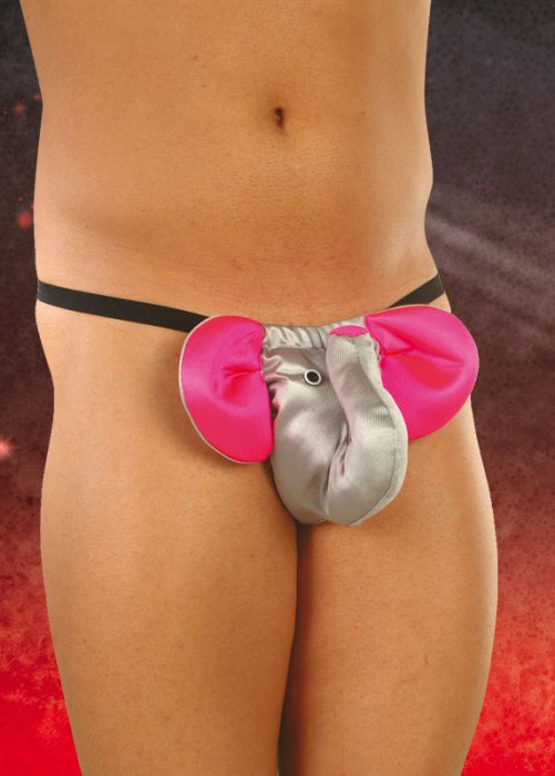 Стринги Слоник, мужские , серебристого цвета , уши и хобот с наполнителем из синтепона, пояс эластичная резинка, размер S/L.