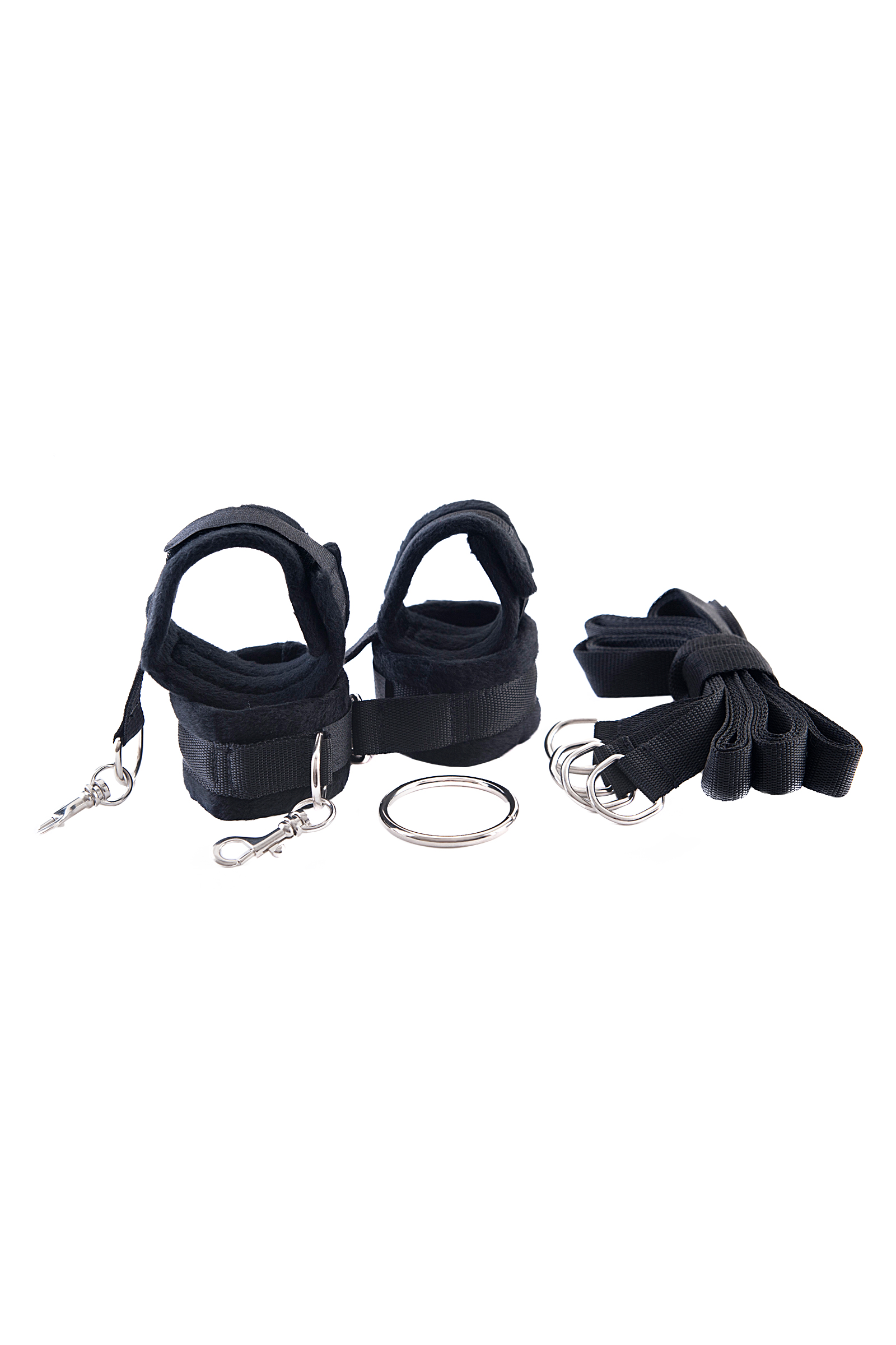 Фиксирующая сцепка, состоящая из мягких наручников и оков, пристегнутых к общему кольцу, ограничивает свободу вашего партнера. Меняйте положение по своему желанию: фиксируйте руки и ноги партнера впереди и сзади. Карабины и цепочки позволяют убрать кольцо и превратить сцепку в наручники и оковы. Замените кольцо на 4 ремня, также входящие в комплект, и испытайте новые варианты фиксации партнера на кровати, у двери или любом другом месте по вашему выбору.